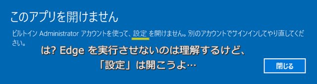 こーんのボケナスがぁ!! 管理者権限で Edge やイメージビューワーを開かせたくないって意図はわかるが、設定画面は開かんかい、このドアホが!! なにさらしてくれとるんじゃワレェ!! このガキゃあ、ぶっからかすぞ!!
